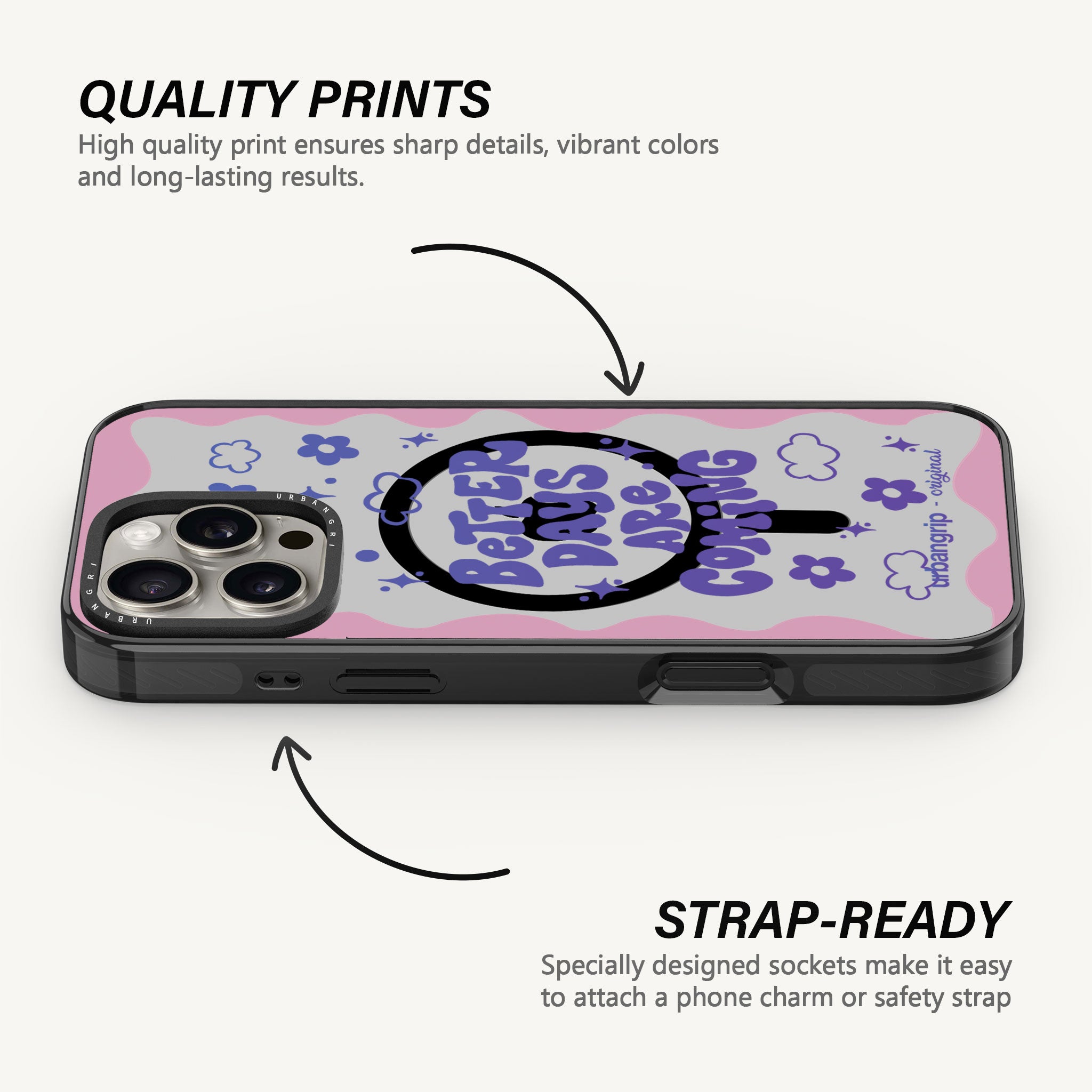 Carry hope in your pocket with the Better Days Case – Silver Sky Edition. This radiant design features a metallic silver base framed by soft pink waves, adorned with whimsical blue illustrations of clouds, stars, and flowers. At its heart, the bold message “BETTER DAYS ARE COMING” shines in playful blue lettering—reminding you to stay inspired, no matter the moment.