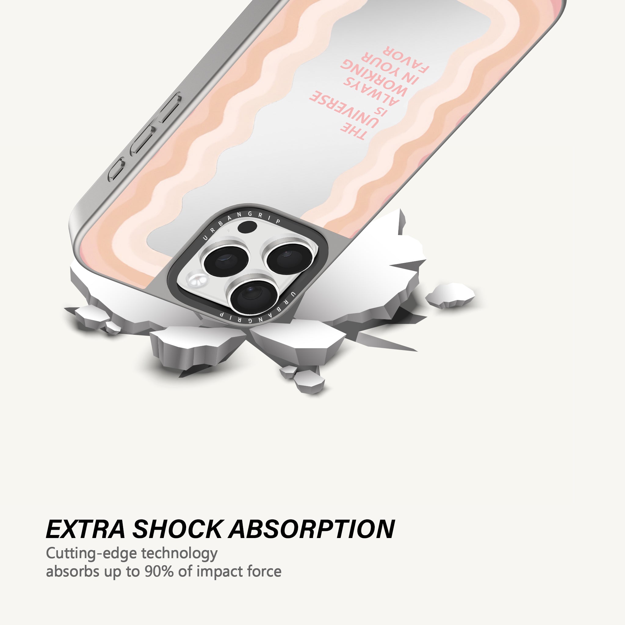 This mobile case balances elegance and mindfulness with a mirror-style center encircled by flowing pastel pink and beige contours. The uplifting affirmation “THE UNIVERSE IS ALWAYS WORKING IN YOUR FAVOR†adds a spiritual touch, while the “URBANGRIP†branding on the camera area emphasizes style and grip. A sleek fusion of beauty and intention.